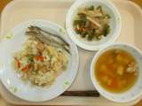 2月21日(水)の給食 牛乳 子ぎつねご飯 五目汁 焼きししゃも 茎わかめと寒天...