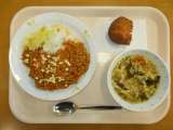 2月14日(水)の給食 牛乳 あげパン (ココア&きなこ) 春雨スープ エスニッ...
