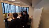 雷門の前にある観光センターでチェックしています。 みんな楽しそうです。 どこの班...