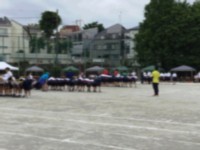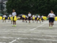 2年生の学年種目「台風の目」です。棒を持ってぐるぐる回りながら走り、棒を飛び越え...