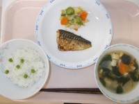 5月28日(水)の給食牛乳グリンピースごはん吉野汁さばのカレー焼き白菜ときゅうり...