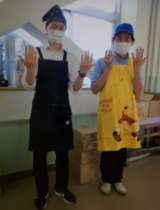 今日から給食が始まりました! 今週は先生たちが配膳を担当します。 エプロンと三角...