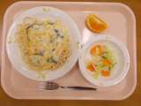 【今日の献立】 ・クリームスパゲッティ ・グリーンサラダ ・果物(オ...