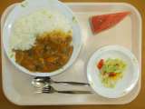 7月12日(水)の給食 夏野菜のカレー 福神漬け パプリカサラダ すいか