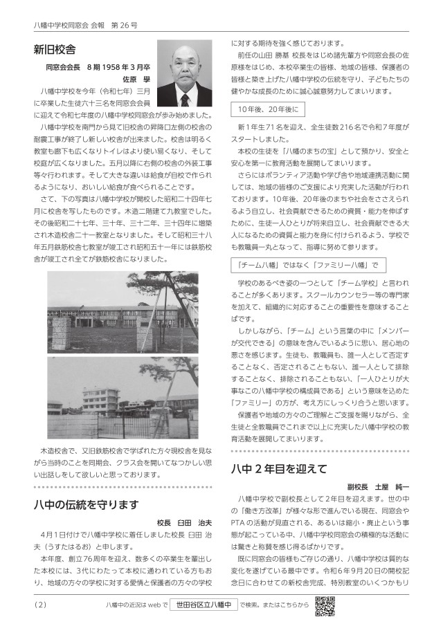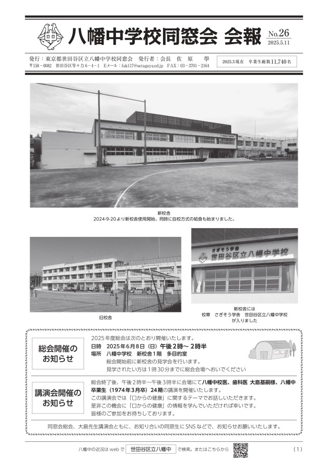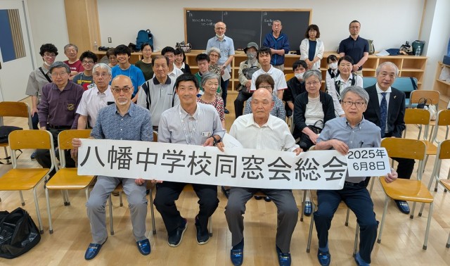 創立以来70年の歴史を持つ八幡中学校は、2024年の卒業生までで、総計11,677名を超える同窓生を輩出しています。毎年同窓会会報を発行するとともに、6月の総会には、毎回60名を越す同窓生が集まります。第一期生から,前年度の卒業生までが一堂に会して、年間活動報告・会計報告や親睦会が開かれます。その後は同期のみなさんで語らいのひとときをもつグループもあるようです。