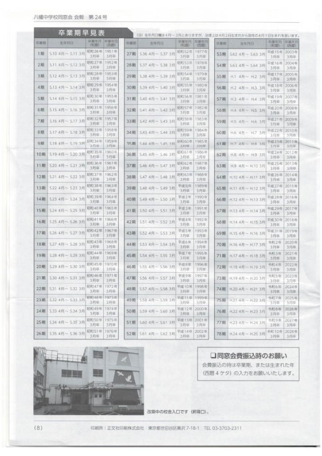 今年から同窓会HPに、同窓会報の表紙、ご自身の卒業した期がわからないと言う皆様ご意見を反映し、卒業期一覧表を掲載することといたしました。