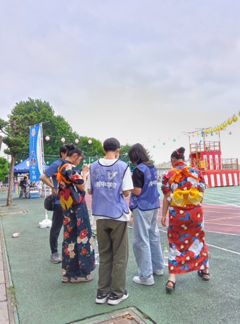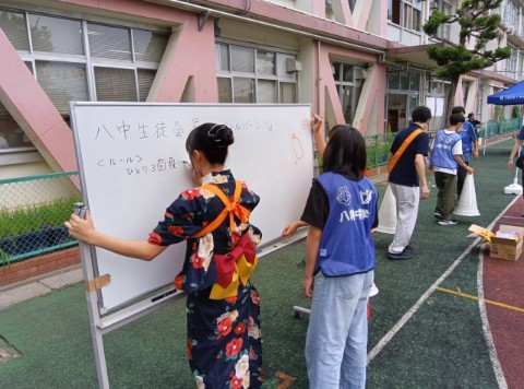 八幡中学校生徒会によるペットボトルバーン!!のコーナー。ルールをホワイトボードに書いています。