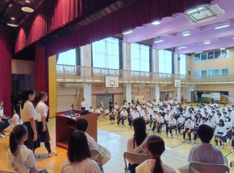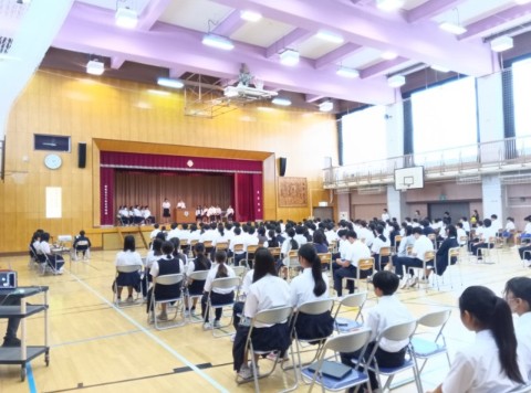 現在、体育館で生徒会役員選挙の立会演説会が行われています。