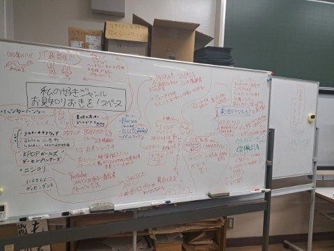 『私の好きジャンル お見知りおきを!のスペース』をホワイトボードにつくり、部員の好きなもの・ことを紹介し合うもの。