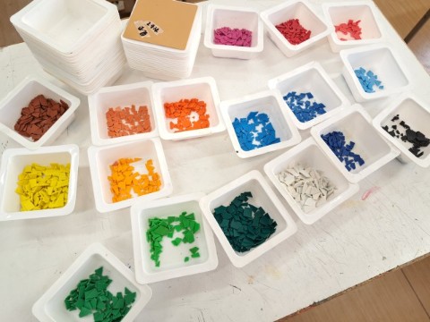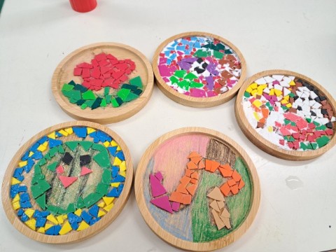 手で割れるような樹脂をモザイク状にボンドで貼り、イラストを表現しています。