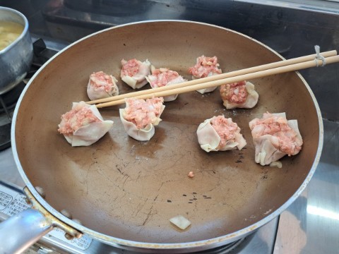 シュウマイの具を皮で包むところに苦戦していますが、上手に仕上がっています。