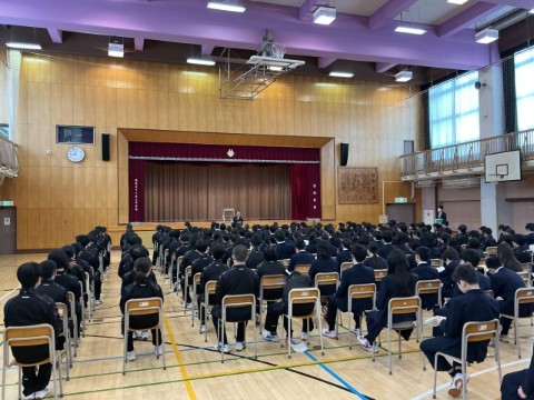 1時間目、全校生徒が体育館に集まっての学活を行なっています。