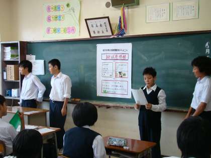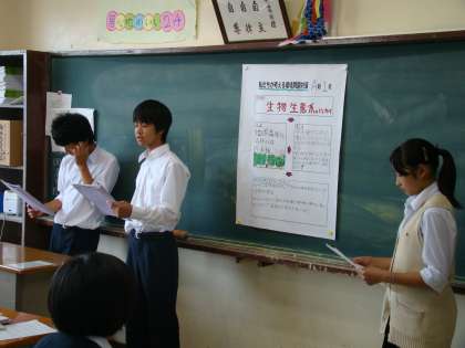 6月の2年生の日本語「哲学」では、グループごとに環境問題について調べ、発表するという学習活動を行いました。役割を分担して、原因・影響・対策を発表しました。