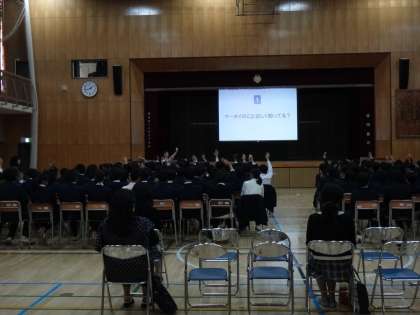 4月17日(水)5校時に体育館でセイフティ教室を開催しました。スマートフォンや携帯電話の正しい使い方や、チェーンメールなどは発信したら加害者になるなど法的な事柄も教えていただきました。
