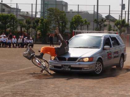 14日(火)5・6校時を使って、交通安全教室が開かれました。今回はスタントの方々が危険な自転車の乗り方をされ、事故の再現を目の前で演じてくれました。