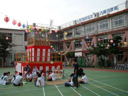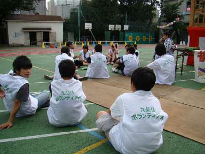 7月18日「八幡小学校親子盆踊り大会」の午後の「九品仏ボランティア会」の活動は、子どもたちとのゲームです。八幡中学校の生徒で「九品仏ボランティア会」に参加している生徒たちは、盆踊り大会前にゲームで子どもたちを楽しませていました。また、終了後の片付けも手伝っていました。ご苦労様でした。