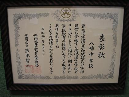表彰の理由は、「地域運営学校のさきがけとして指定を受け、学校・家庭・地域が一体となった教育活動に取り組んできた。学校運営委員会の活動を通して、地域の声を学校経営に反映させるとともに、地域と一体となって様々な活動を展開し、保護者や地域の人々の学校運営への参画の推進に大いに貢献した」というものです。