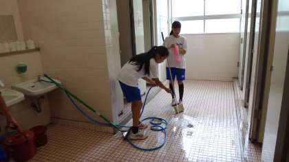 19日は終業式と大掃除です。本校では全員がトイレ掃除を経験します。トイレ掃除担当教員が丁寧にトイレ掃除の方法を教えています。生徒はきちんと掃除の方法を覚え、トイレを使用する際も掃除する人に配慮をするようになります。
