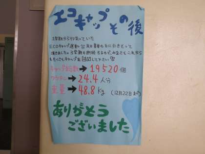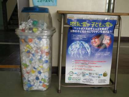 生徒昇降口の回収ボックスには多くのキャップが集まっていますが、もっとたくさん集めたいと思っています。