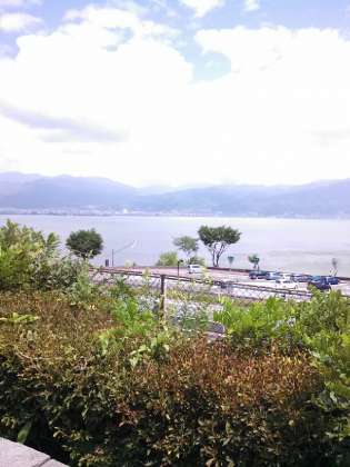 途中渋滞で少し遅れてますが、良い天気です。写真は諏訪湖です。