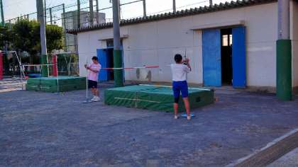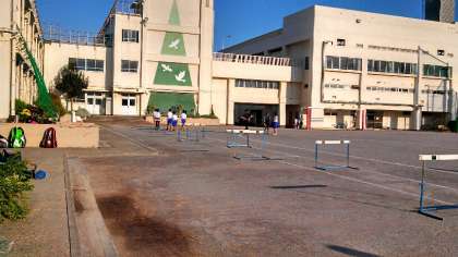 ハードルや高跳びなど各種目に分かれて練習しています。本日から始まった教育実習生の先生方も練習に参加しました。