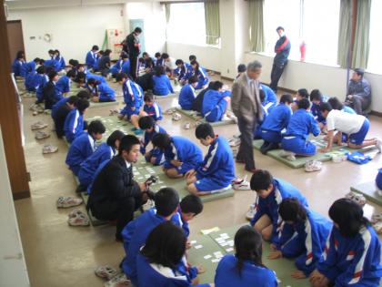 3月7日、1年生の「百人一首大会」が行われました。生徒は、この日までに授業などを通して百人一首を学びぶととのに、一人一人が一生懸命に覚えてきました。その成果として、読み手が上の句を読むとすぐに札を取る音と歓声が聞こえ、会場全体はとても活気がありました。生徒たちが生き生きしている活動していました。