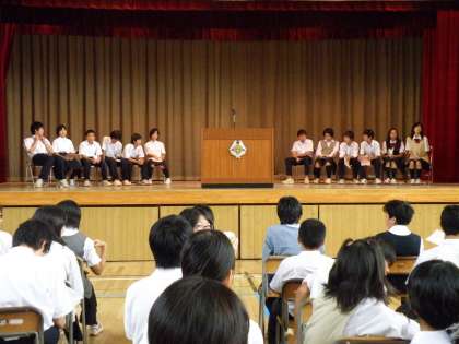 9月11日、6時間目の生徒会立会演説会では、生徒会長候補2名、男子副会長候補子3名、女子副会長候補1名、2年庶務候補男女各1名、1年庶務候補男女各2名の12名の立候補者が舞台に上がりました。