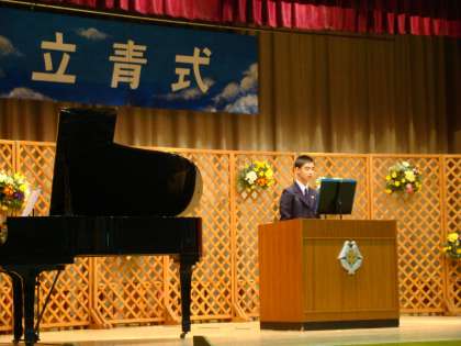 昨年11月から、2学年の全生徒がそれぞれに題材を考え、自分の考えや思いなどを書き始めました。その意見文を先月各学級で発表し合い、本日の立青式で発表する代表者を選出しました。