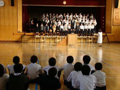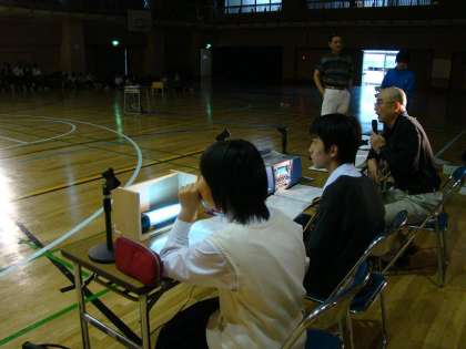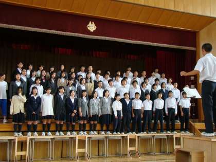 写真は1年生と3年生の合唱の練習風景と舞台発表のリハーサルで司会の練習を行っていす。