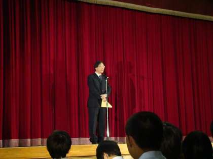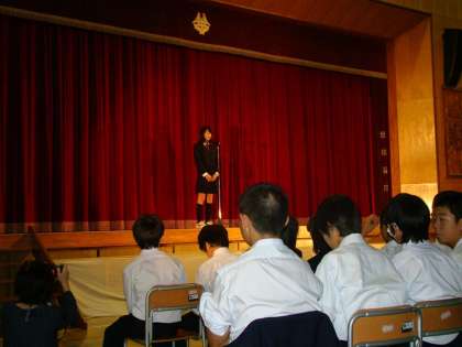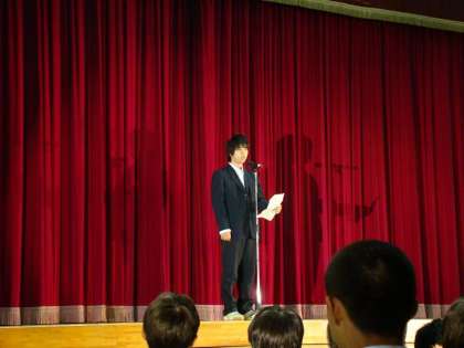 開会式では、学芸発表会実行委員の谷澤さんの「開会のことば」、校長先生のお話、生徒会長のあいさつがありました。