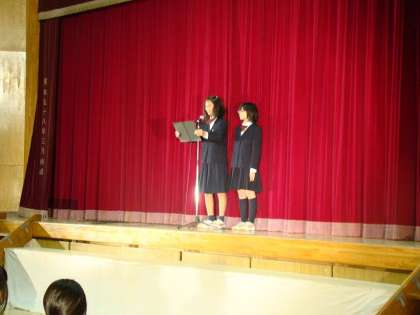 閉会式では、校長先生のお話の後、学芸発表会会実行副委員長の3年植木さんと湯澤さんがあいさつをしました。