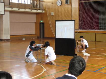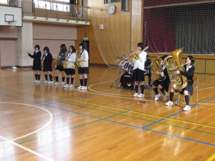 2・3年生の各部の生徒たちが、3分間という短い時間で日常の活動を紹介しました。練習のようすや部員を紹介する部、部活紹介ビデオを作成し上映する部、吹奏楽部やヒップホップダンス(ステップ)のように実演した部など、それぞれの部が工夫していました。また、バンドセミナー(ステップ)の紹介は「おやじバンド」の方に紹介していただきました。