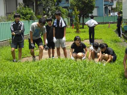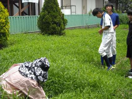 12時よりボランティア清掃を行いました。皆暑い中一所懸命草取り、小石拾いを行いました。