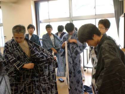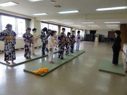 学校公開週間、3年生は日本語「日本文化」の授業で「ゆかた着付け体験」を行いました。講師の方々をお招きして、男子女子それぞれの着付けのコツを教わり、悪戦苦闘しながらも「ゆかた」を着付けることができました。最後は全員で集合写真を撮り、着物文化の一端に触れることができました。