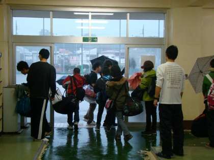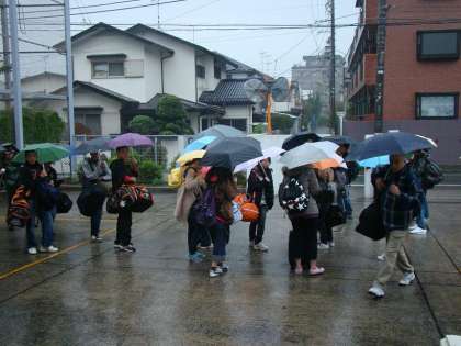 11月11日、2年生河口湖移動教室に出発する日ですが、生憎の雨のため、出発式は生徒昇降口で行いました。