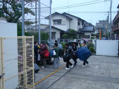 小雨の中、2年生が無事に帰ってきました。厚着をしている生徒が多く、東京に比べて気温が低かったことが伝わります。