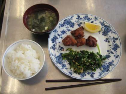 ごはん・鶏のからあげ・ほうれんそうのナムル・お味噌汁をつくりました。