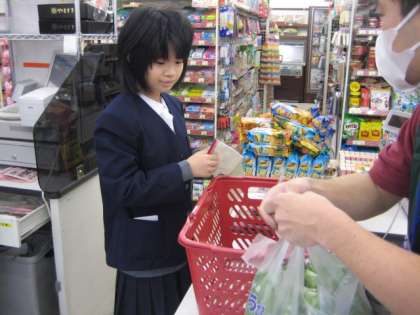 それぞれが分担した食材を探しています。同じようなものが並んでいて、いったいどれを買えばいいのだろう・・・と迷っている姿もありました。レジに並び、お金を払います。お金が足りなかったというハプニングも経験のうち。先生やお店の人に伝えながら支払いをすることができました。