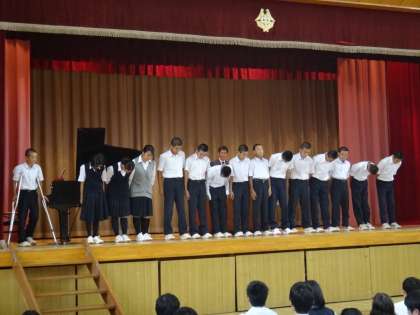 いよいよ、2学期が始まり、元気な顔が集まりました。夏休みの大会の表彰がおこなわれ、バスケット部、野球部、陸上部、バドミントン部が表彰されました。