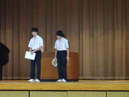 陸上部とバトミントン部の表彰風景です。校長先生からメダルをかけていただきました。