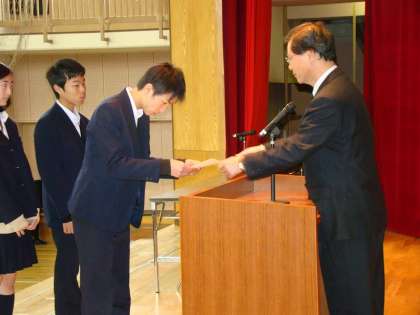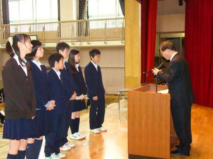 代表して金賞の3年染谷君、内藤さん、谷澤さん、2年三浦君、1年鈴木君、武井のさんの6名を表彰しました。