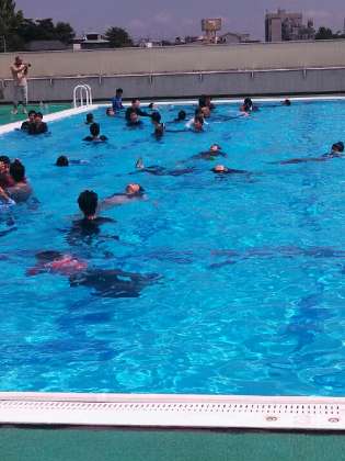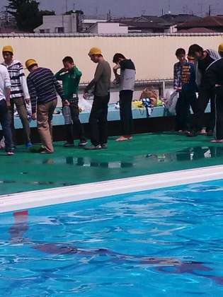服を着て泳ぐのが大変です。服に空気を入れる練習もしました。