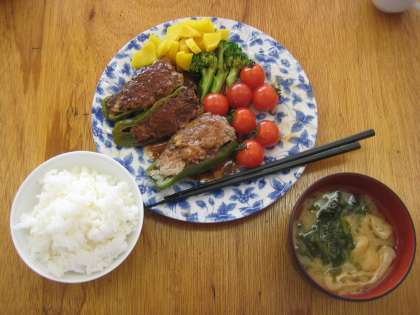 本日のメニューは「ピーマンの肉詰め・大根と油揚げのお味噌汁・ごはん・ブロッコリー・トマト・たくあん」でした。3年生のリクエストメニューです。