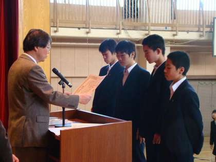 12月2日の全校朝礼では、英語スピーチコンテスト、バスケットボール部、野球部、薬物乱用防止ポスターの表彰がありました。