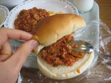 12月3日(木)の給食はミートサンド・コーンスープ・キャベツとベーコンソテーでした。ミートサンドはミートソースをパンにはさんで食べます。2枚目の写真がはさんでいる様子です。パンに切れ目が入っていることに気づかず・・・そのまま別々に食べてしまう生徒もいました。