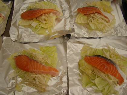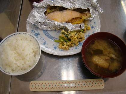 今回の調理では、鮭のホイル焼き・青菜の卵とじ・きのこの味噌汁を作りました。商店街のお魚屋さんなどで材料を買い揃えてきました。味噌の味付けのされた鮭と野菜は絶品でした。次もがんばろう。