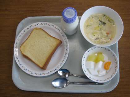 本日のメニューは「ハムチーズトーストサンド・白菜のクリームスープ・フルーツ杏仁」でした。