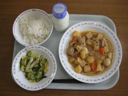 14日(月)の給食です。「ごま入りごはん・肉じゃがうま煮・くきわかめのサラダ・味噌ドレッシング」です。肉じゃがのうま煮は凍り豆腐が入っているのが普通の肉じゃがと違うところでしょう。凍り豆腐をみて、「スポンジ」という生徒もいましたが、実は豆腐であることを伝えると驚いていました。