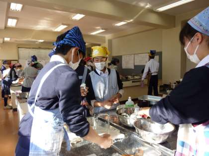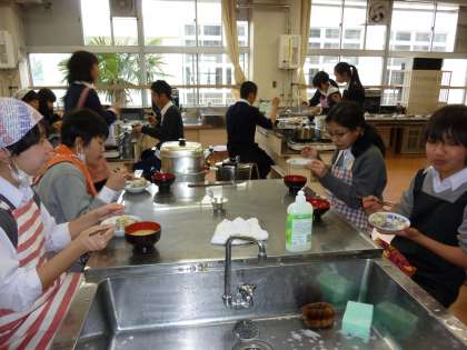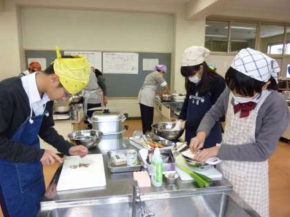 先週と今週、1学年家庭科の授業で調理実習が行われました。手際良く作業を進める人や、慣れない調理に悪戦苦闘する人など様々でしたが、皆、一生懸命取り組んでいました。出来上がったシューマイとスープはおいしく頂きました。