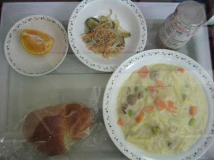 本日のメニューは「ニューバターロールパン・コーヒー乳飲料・ハムとほたてのクリーム煮・デコポン・大根とじゃこのかりかりサラダ」でした。